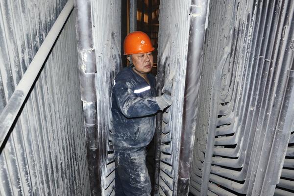 9月13日,該廠鍋爐焊工正在1號(hào)爐磨煤機(jī)內(nèi)部,割除磨損嚴(yán)重的3臺(tái)磨煤機(jī)下煤斗支架,為更換新的支架做好準(zhǔn)備。