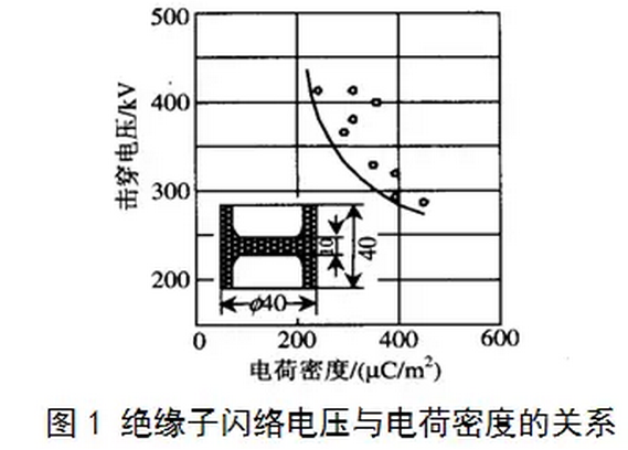 圖1為日本三菱公司K.Nakanishi, A.Yoshioka[2]等人對(duì)中間實(shí)心的圓桶形絕緣子模型施加一系列直流電壓后,得到的絕緣子表面擊穿電壓隨電荷密度的關(guān)系。