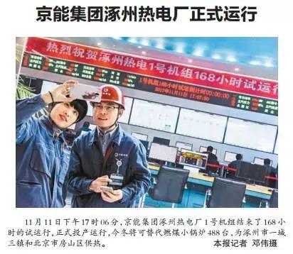 《北京日?qǐng)?bào)》(11月13日第17版)對(duì)華北院設(shè)計(jì)的京能涿州熱電新建項(xiàng)目進(jìn)行了報(bào)道,報(bào)道中指出,“該項(xiàng)目正式投產(chǎn)運(yùn)行,今冬將可替代燃煤小鍋爐488臺(tái)”,為改善城市大氣環(huán)境,保護(hù)地區(qū)生態(tài)環(huán)境和景觀資源做出重要貢獻(xiàn)。