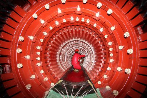 建設(shè)者正在寧夏棗泉電廠1號(hào)機(jī)組發(fā)電機(jī)定子內(nèi)檢查作業(yè)。張軍 攝