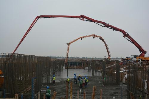 #3號(hào)筏板基礎(chǔ)是越南海陽(yáng)主廠房最大的一塊筏板基礎(chǔ),長(zhǎng)44.8米、寬20.93米、厚度2.5米。筏板基底標(biāo)高負(fù)7.3米,澆筑方量較大,混凝土布料較復(fù)雜。為了保安全、保質(zhì)量、順利完成本次澆筑工作,該項(xiàng)目部借鑒煙囪、鍋爐大體積澆筑經(jīng)驗(yàn),不斷優(yōu)化施工方案,精細(xì)策劃、層層交底,在澆筑過(guò)程中,對(duì)攪拌站、運(yùn)輸?shù)缆?、用水用電、作業(yè)現(xiàn)場(chǎng)、土建實(shí)驗(yàn)室等進(jìn)行全過(guò)程24小時(shí)全環(huán)節(jié)的值班監(jiān)護(hù),重點(diǎn)監(jiān)護(hù)基坑的安全穩(wěn)定性,及時(shí)協(xié)調(diào)解決混凝土澆筑過(guò)程中出現(xiàn)的問(wèn)題,確?;炷涟踩樌麧仓?。