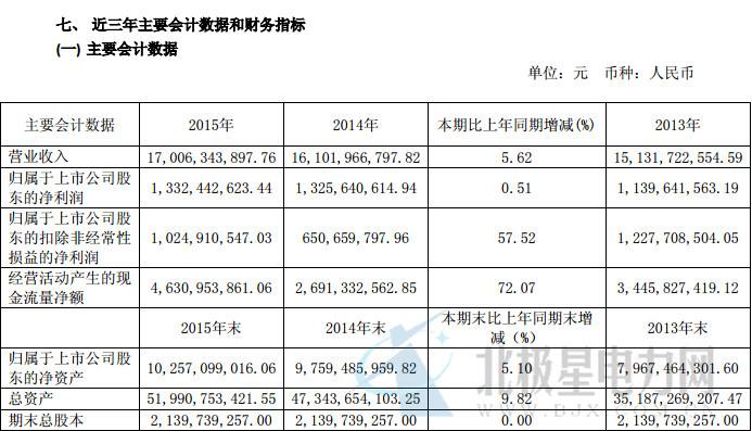 根據(jù)公司發(fā)展及經(jīng)營實際情況,考慮到公司發(fā)展項目所需資金量較大,建議本次利潤分配方案為:按2015年底總股本2,139,739,257股為基數(shù),每股派發(fā)現(xiàn)金紅利0.25元(含稅),預(yù)計分配534,934,814.25元。