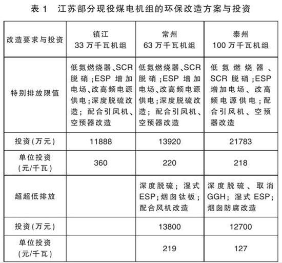 對(duì)于現(xiàn)役煤電機(jī)組的環(huán)保改造,不同電廠環(huán)保設(shè)施基礎(chǔ)不同,環(huán)保改造的內(nèi)容也有所不同。如表1給出了江蘇省3家電廠3臺(tái)煤電機(jī)組的改造方案與投資比較。