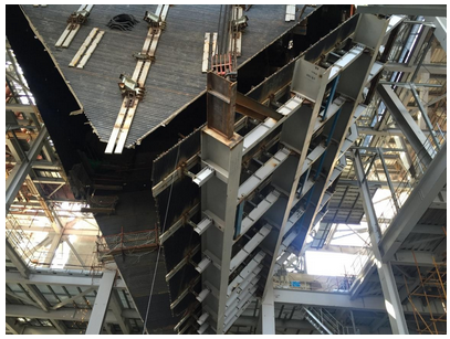 此次吊裝的項(xiàng)目為下部水冷壁前墻組件,組件重38t,吊裝采用4臺(tái)卷?yè)P(yáng)機(jī)抬吊的方式。為保證吊裝工作的順利實(shí)施,吊裝前根據(jù)《前水下部水冷壁組件吊裝前安全環(huán)境檢查確認(rèn)表》內(nèi)容對(duì)現(xiàn)場(chǎng)環(huán)境逐一進(jìn)行確認(rèn),并在現(xiàn)場(chǎng)做好人員、機(jī)械、工器具資源的合理配置,對(duì)吊裝相關(guān)人員進(jìn)行安全交底,并辦理了安全作業(yè)票,最終在全體人員的共同努力下,圓滿(mǎn)順利完成了此項(xiàng)吊裝工作。