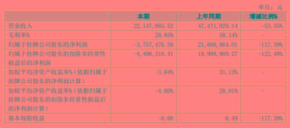 報告期末公司總資產(chǎn)為149,828,101.03元,較期初減少11.24%;歸屬于掛牌公司股東的凈資產(chǎn)為95,928,204.65元,較期初減少3.77%。