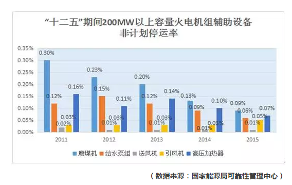 數(shù)據(jù)顯示:“十二五”期間,火電機(jī)組輔助設(shè)備總體可靠性不斷提高,非計(jì)劃停運(yùn)率下滑趨勢明顯。其中: