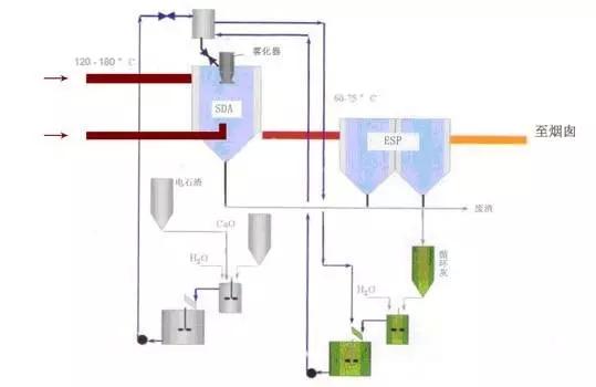 噴霧半干法是利用噴霧干燥原理,將吸收劑漿液霧化噴入吸收塔。在吸收塔內(nèi),吸收劑在與煙氣中的二氧化硫發(fā)上化學(xué)反應(yīng)的同時(shí),吸收煙氣中的熱量使吸收劑中的水分蒸發(fā)干燥,脫硫反應(yīng)后的廢渣以干態(tài)排出。
