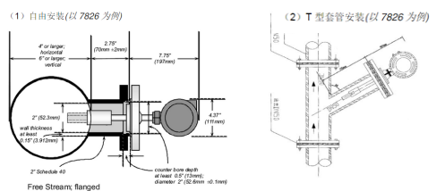 目前,根據(jù)管道尺寸及介質(zhì)的流速不同,音叉密度計(jì)安裝方式有兩種,自由安裝和T