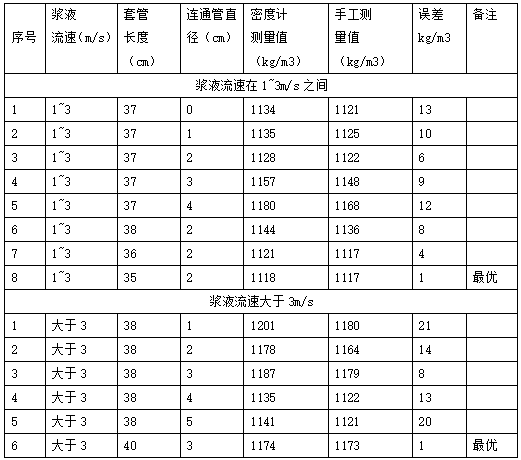 第二步,在連通管直徑為2cm情況下,加長(zhǎng)或縮短密度計(jì)取樣套管長(zhǎng)度,通過(guò)實(shí)驗(yàn),在套管長(zhǎng)度為35cm時(shí)測(cè)量值與手工測(cè)量值誤差絕對(duì)值最小為1kg/m3。