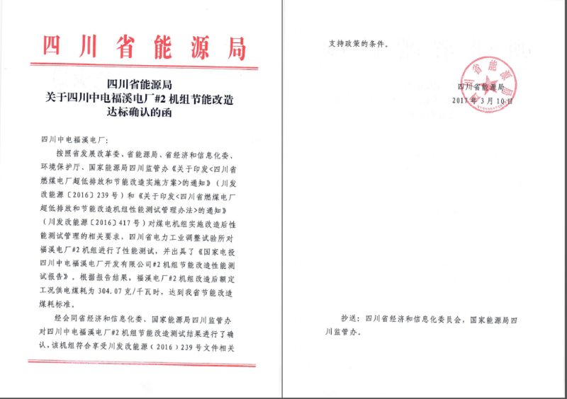 2017年1月9日至1月21日,四川省電力工業(yè)調(diào)整試驗(yàn)所按照川發(fā)改能源〔2016〕417號(hào)《四川省燃煤電廠超低排放和節(jié)能改造機(jī)組性能測試管理辦法》的要求,完成了福溪發(fā)電2號(hào)機(jī)組的節(jié)能驗(yàn)收試驗(yàn)。3月10日,四川省能源局會(huì)同省經(jīng)信委、國家能源局四川監(jiān)管辦發(fā)文對(duì)該測試結(jié)果進(jìn)行了確認(rèn),明確了該機(jī)組符合享受川發(fā)改能源(2016)239號(hào)文件相關(guān)支持政策。